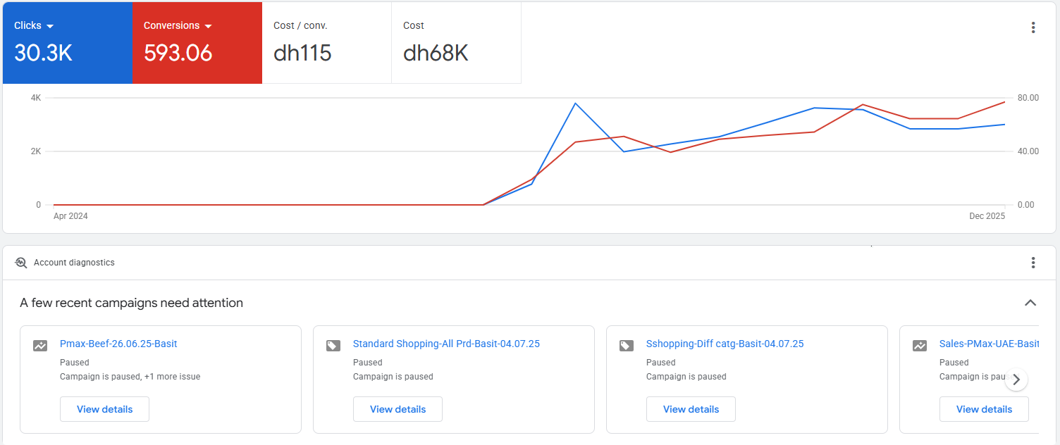 This campaign achieved strong long-term results with a clear focus on efficiency and scalable growth. Over time, it generated 30.3K clicks and 593 conversions, maintaining an average cost per conversion of dh115. With a total ad spend of dh68K, the campaign demonstrated effective audience targeting and continuous optimization, resulting in steady performance improvements across the timeline. The upward trend in conversions reflects a strategy built around quality traffic and consistent testing, making this account well-positioned for further scaling and profitability.